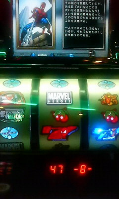 1Kでベル重複赤7ゲット。続いて60G位でまたしてもベル重複赤7ゲット。これでスーパーマーベルチャンス(SMC)をゲット。そしてなんとこの赤7中にハズレ降臨。これでSMC計350Gゲット。